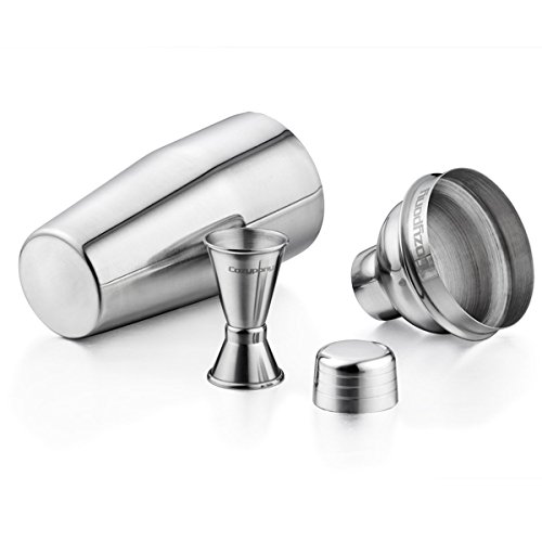 It’s Cozypony Home Stainless Steel Cocktail Shaker that meets your requirement. Featuring a built-in strainer, a 24 ounce shaker and a 1 & 1/2 oz jigger, this cocktail shaker set is just what you want to produce drinks your guests will love.